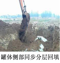 設(shè)備就位后平穩(wěn)放置罐體,回填土方應(yīng)采取先回填罐體腋角夾角及罐體四周兩側(cè)穩(wěn)定夯實(shí),土方穩(wěn)定罐體后注水保平穩(wěn)沉降。回填土方要進(jìn)行篩選無尖角石塊及建筑垃圾。土方回填杜絕鉤機(jī)、鏟車高空拋擲土方渣土從罐體上部重力沖擊回填,罐體注水應(yīng)與分層回填夯實(shí)土方同步,且灌水注入口不得單獨(dú)從罐體進(jìn)水口、出水口或清掏口單獨(dú)注水,應(yīng)從兩處清掏孔同步進(jìn)水,保證地埋儲罐內(nèi)部進(jìn)水水壓平衡。灌水沉降后按圖紙標(biāo)高連接外網(wǎng)管道并保證密封處理,灌水量分時(shí)段注入,總水量不低于設(shè)備容積的2/3以保障罐體與承重地基平穩(wěn)沉降。在雨季施工時(shí),要有排水措施,防止基坑積水及邊坡坍塌,同時(shí)將罐體內(nèi)注水防止漂移而造成位移。